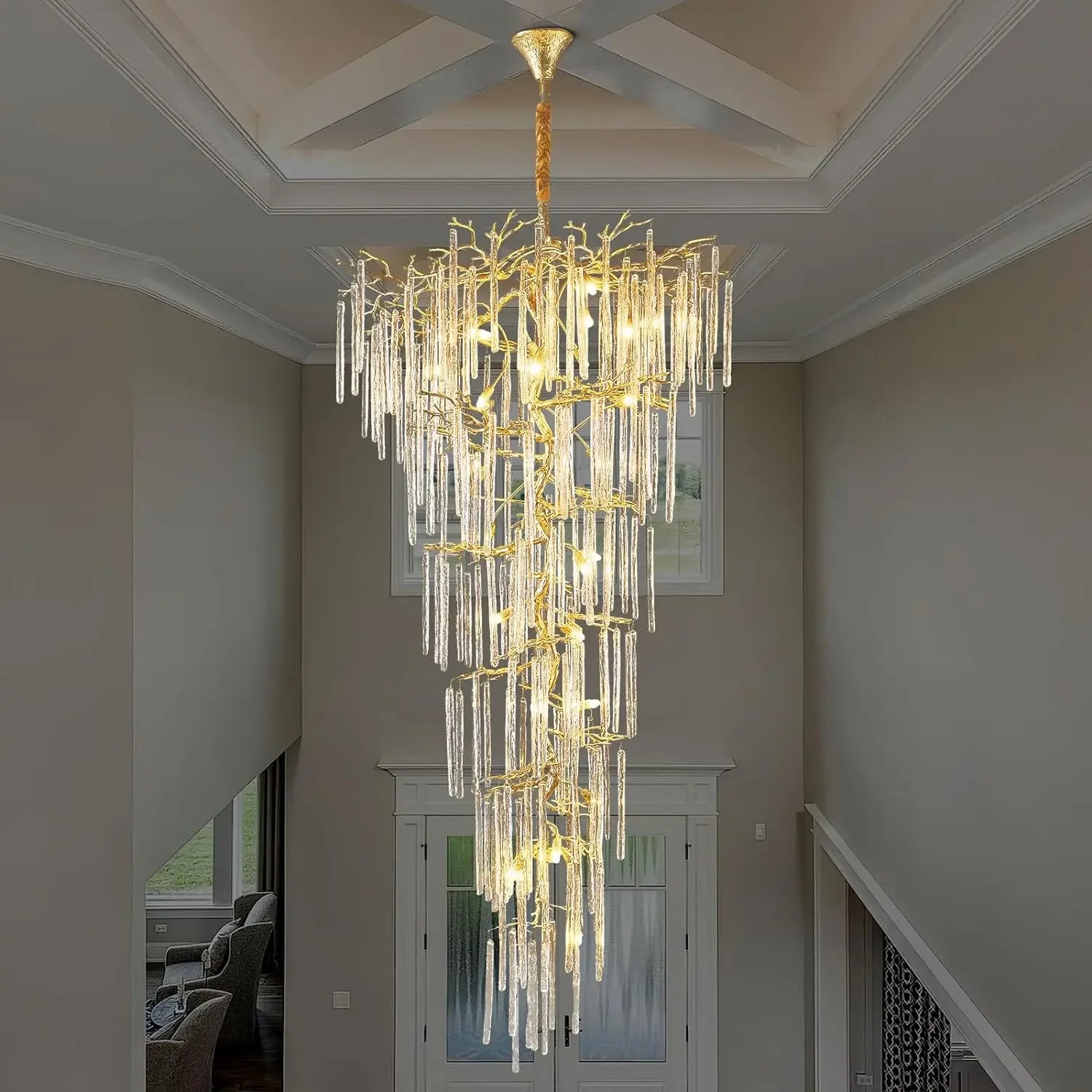 Sculptural branches of hand-cut crystal descend in dramatic tiers, transforming your stairwell or double-height space into a gallery of refracted brilliance. Each facet captures and multiplies natural light by day; by night, the fixture becomes a glowing centrepiece that commands attention from every angle.