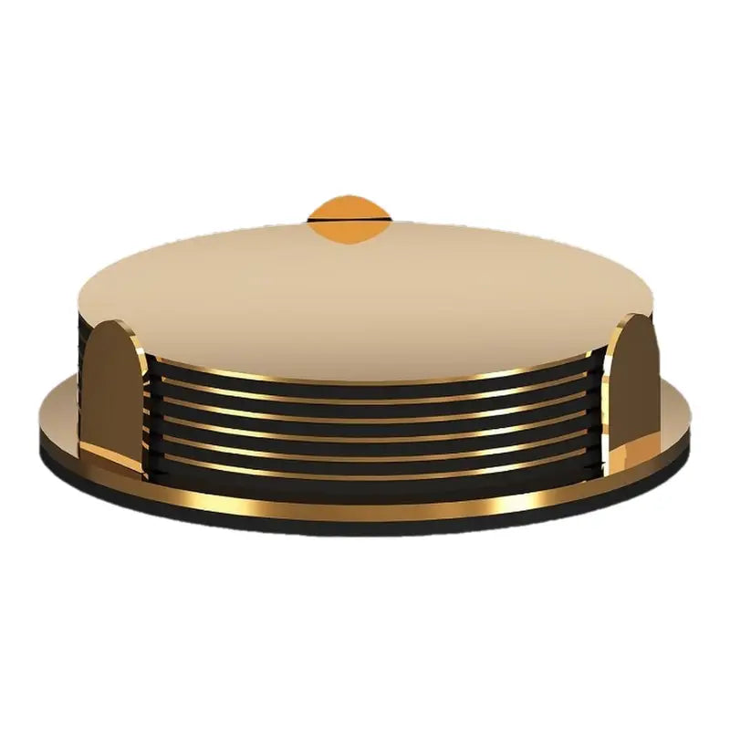 Six mirror-gold stainless steel coasters, sleek and weighty, protecting surfaces with elegance. Dishwasher-safe, perfect for gifting or upscale gatherings.